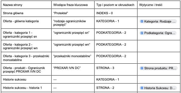 Z przygotowanej tak mapy stworzyliśmy indeks, który posłużył nam do systemowej pracy nad produkcją treści i umożliwił śledzenie postępów. W kolumnie wytyczne dla każdej strony opracowaliśmy szczegółowy brief, który omawiamy w następnym podrozdziale.