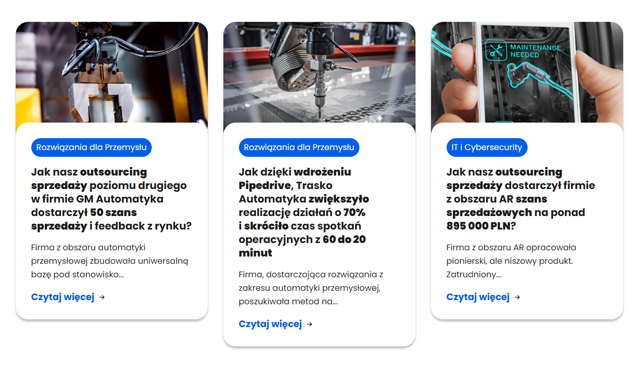 Tematy poruszane na blogu pokazują, jakie problemy firma rozwiązuje. Historie sukcesów klientów potwierdzają, że potrafi je dobrze rozwiązać. Elementem wieńczącym prezentację firmy i zachęcającym do nawiązania kontaktu jest oferta.